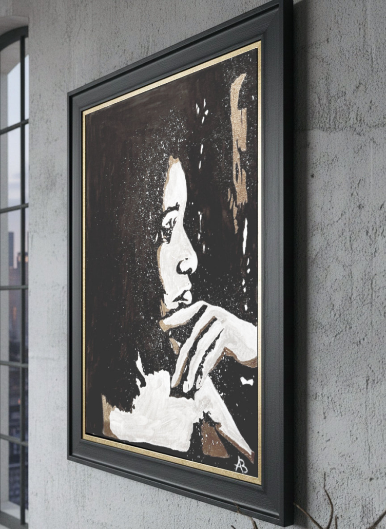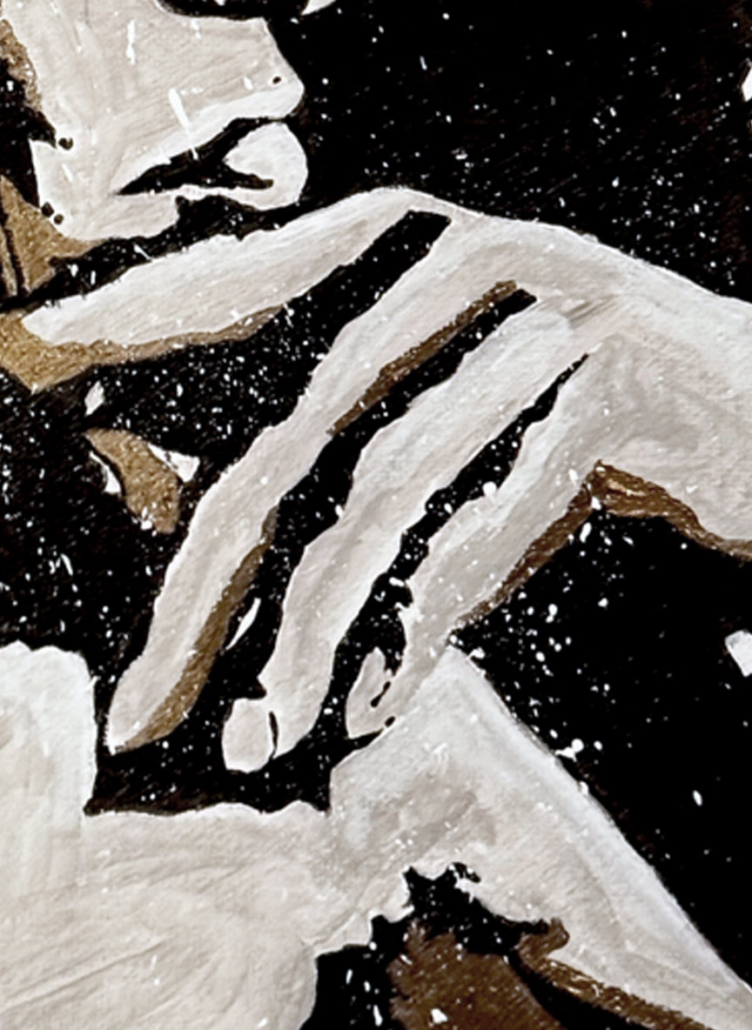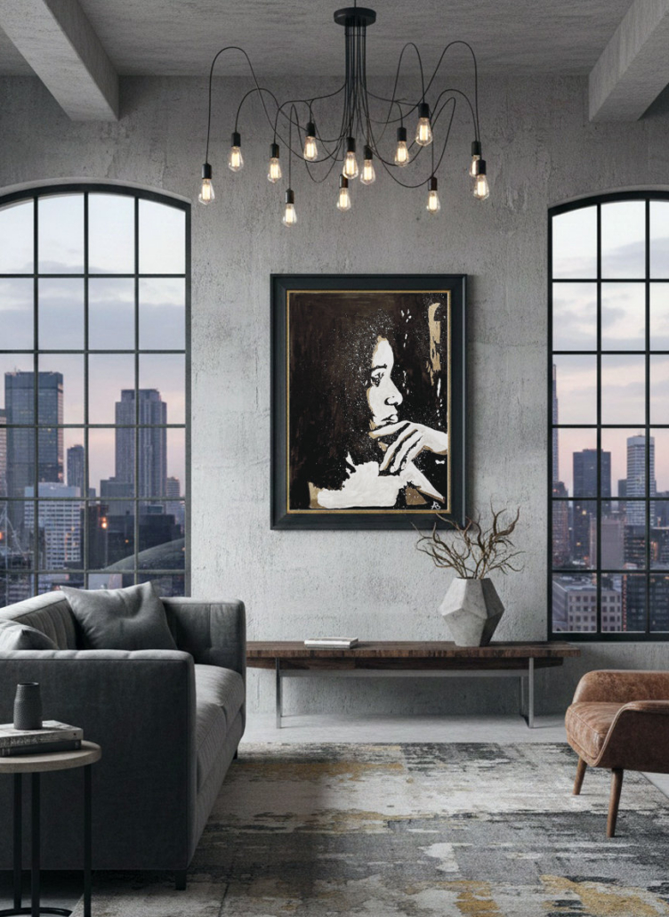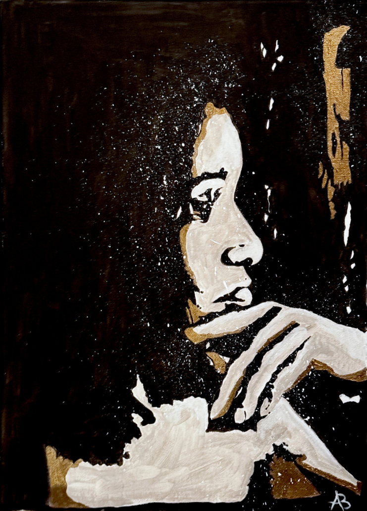 Dall’ombra profonda dei capelli mossi, il profilo emerge, scolpito da un fascio di luce bianca e tocchi d’oro. La mano al mento è un gesto di quieta contemplazione, l’anima che si sofferma in un momento di intensa introspezione.